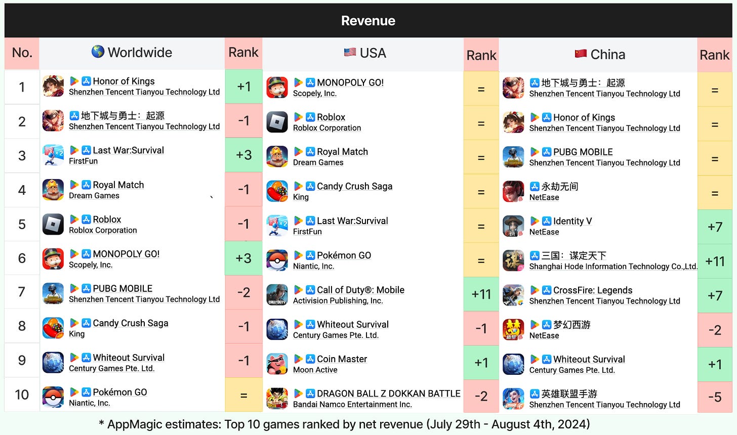 Top Revenue: Honor of Kings reclaims the #1 worldwide revenue rank from Dungeon & Fighter: Origin!