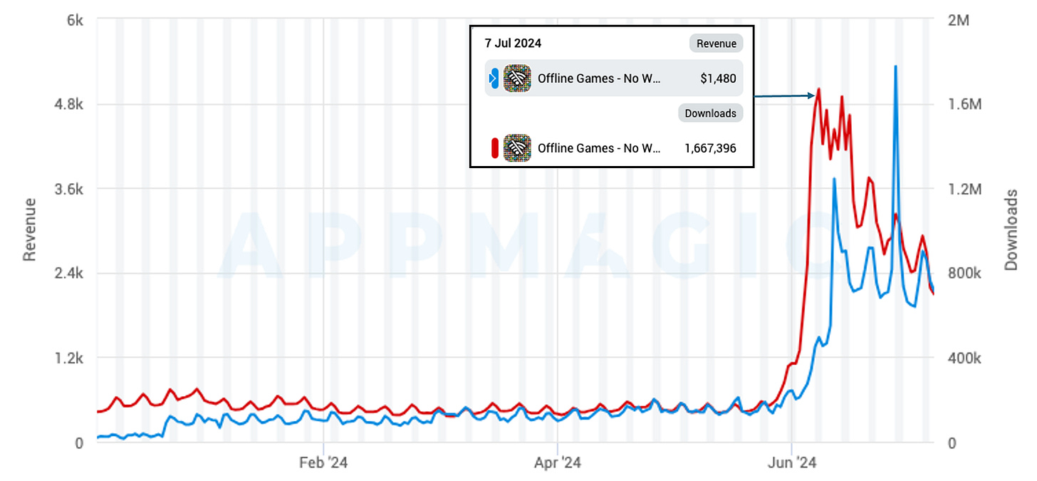 Curiously, the game didn’t take off from its launch in August 2023. For 11 months, it generated a healthy amount of downloads but was generally under 200K daily until last month.