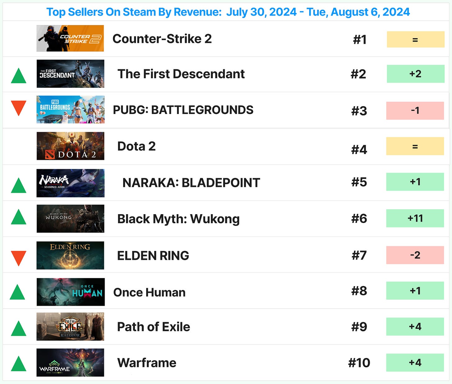 Top Steam Revenue: Counter-Strike 2 holds on to #1, but The First Descendant takes #2 and may contend for the top spot over time.