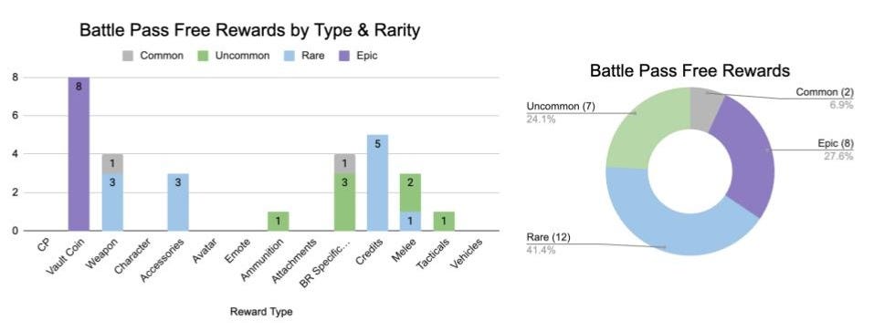 The charts above reveal the premium track's focus on epic-tier rewards, which dominate the distribution at over 70%. The track also features one legendary reward, adding prestige and rarity to the progression system. This strategic distribution reinforces the premium track's value proposition, offering items that free track players do not have access to.