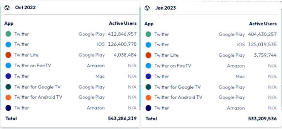 The above data shows that before Elon’s acquisition, Twitter typically acquired between 300K - 800K users per month. This likely does not explain the entire monthly active user gap, and trying to back out this impact fully involves complexity outside this post's scope. However, not buying, let’s say, 1.3M in aggregate users from October through January would have some impact. And you have user stacking from previous months of buying as well.