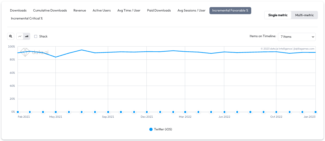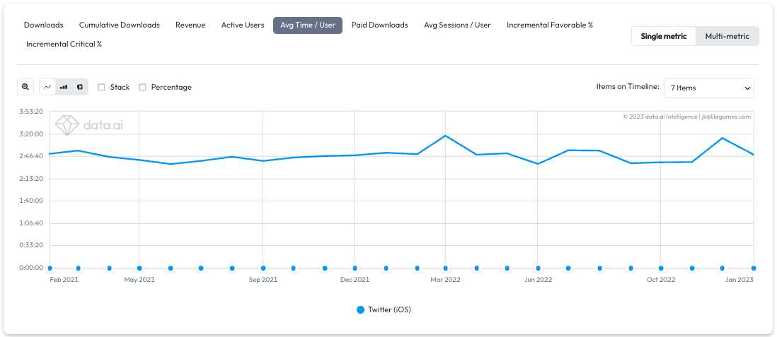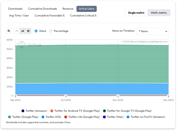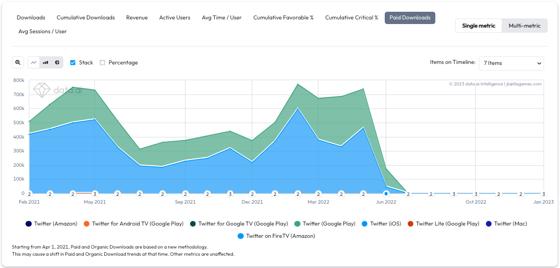Let’s now take a look at data.ai estimates of paid downloads by Twitter over the past two years. We notice that Twitter has been actively buying users for its service but abruptly stopped in July of 2022.