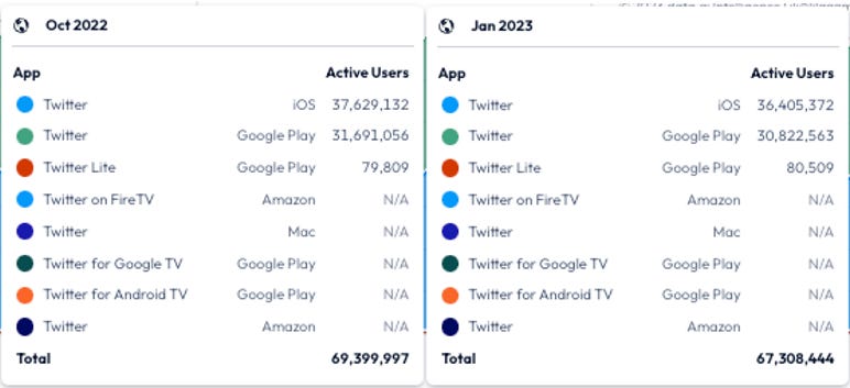 “The number of people using Twitter in the US has decreased almost 9% since Elon Musk took over.”