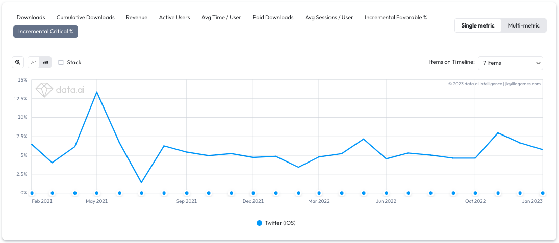 While there does seem to be a spike in critical reviews from last November, one month after Elon’s Twitter acquisition, critical reviews seem to be dropping. Further, critical reviews from a historical perspective are not nearly as high as whatever happened in May of 2021.