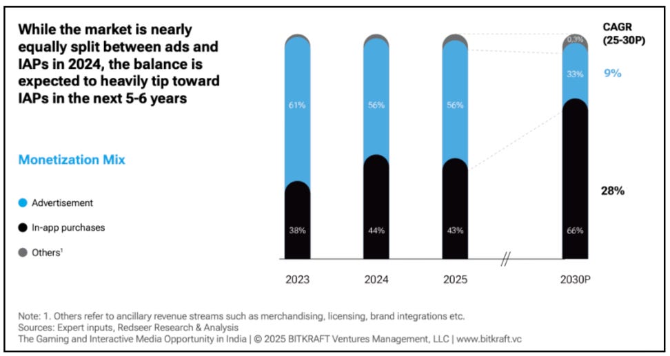 Genre diversification historically follows monetization maturity. In India, ARPPU increased 9x from $3 in FY20 to $27 in FY25. In-app purchases (IAPs), which accounted for 38% of revenue in FY23, are projected to reach 66% by FY30, overtaking advertising as the primary monetization lever.