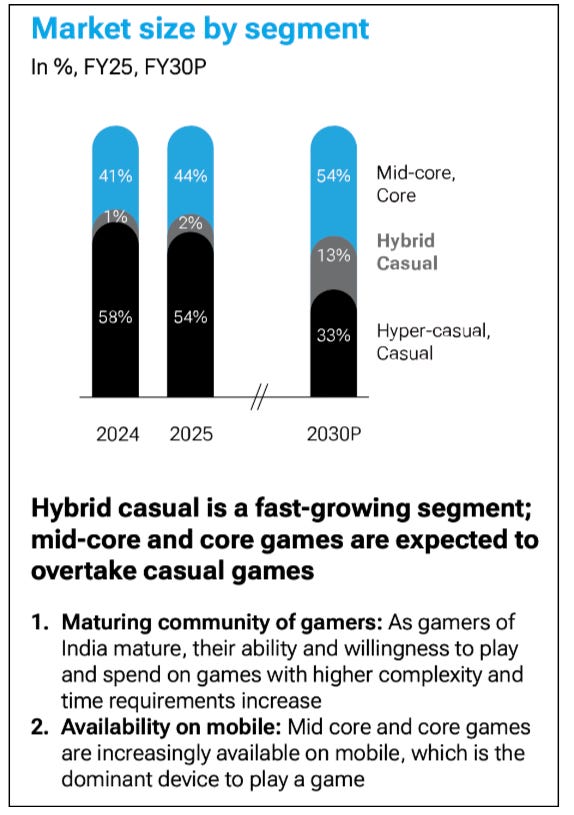 As the market matures, developers who address other motivations—such as competition, progression, status, and creativity—will unlock new segments. The early signs are visible: hybrid casual games, which blend casual mechanics with mid-core progression systems, are the fastest-growing segment. Mid-core and core games are expected to grow from 41% of the market in FY24 to 54% by FY30.