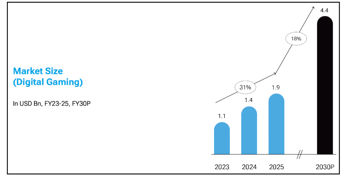 The RMG ban didn’t destroy demand—it redirected it. Approximately 140 million paying gamers, accustomed to daily gaming sessions and mobile payments, are transitioning from skill-based gambling to free-to-play (F2P) entertainment. Digital gaming is projected to grow from $1.9 billion (FY25) to $4.3 billion (FY30) at an 18% CAGR.