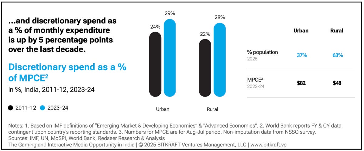 Translation: India’s economy runs on consumer spending, not just exports or manufacturing. This creates a foundation for discretionary purchases, such as gaming.