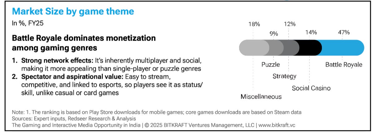 When one genre captures nearly half of all revenue in a market projected to double in five years, it signals that user demand is ahead of supply-side innovation. Battle Royale succeeded because it solved for India’s two dominant gaming motivations: socializing (cited by 40-50% of mobile gamers) and familiarity (50% of gamers in FY24 preferred local games with regional content).