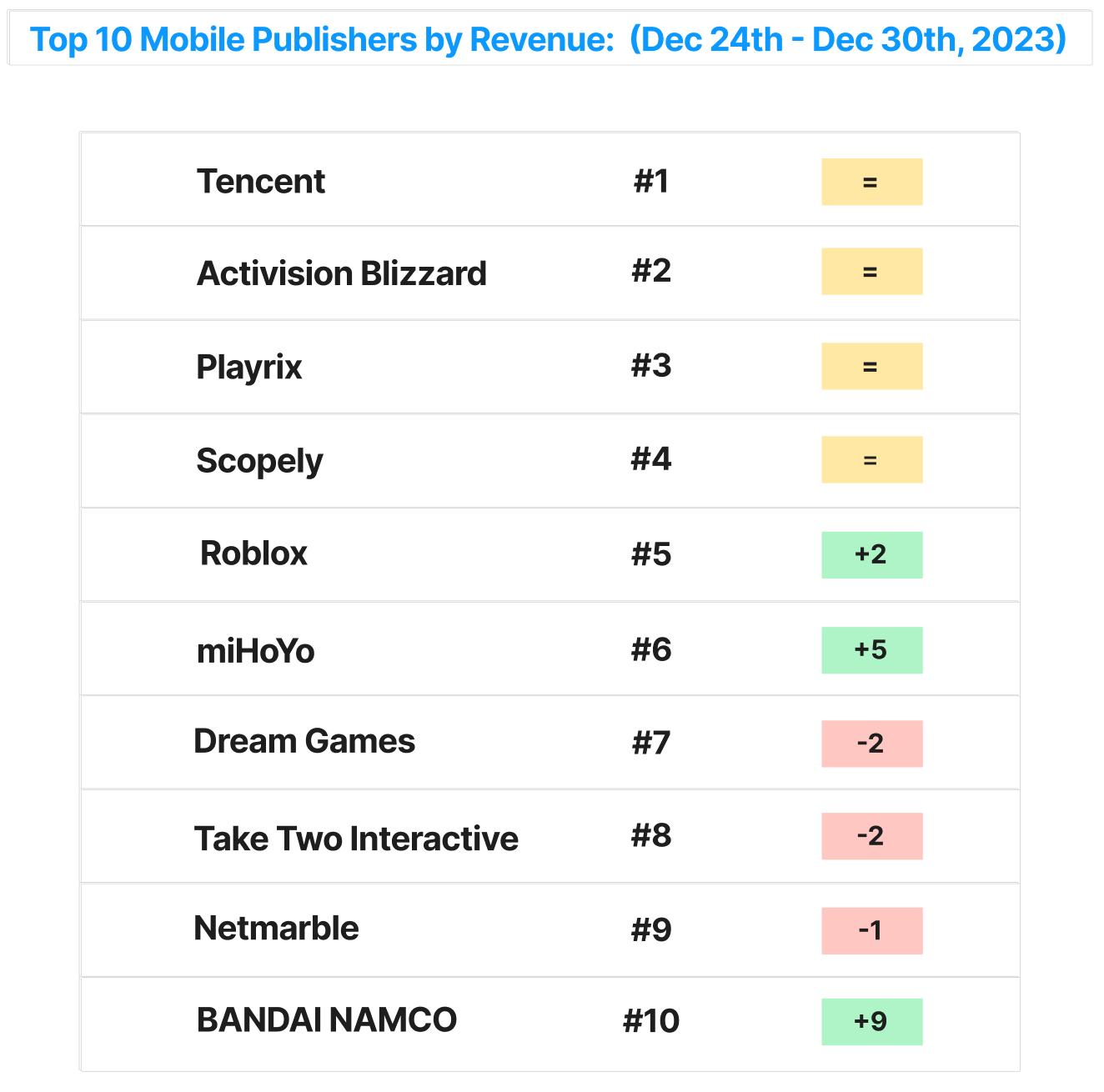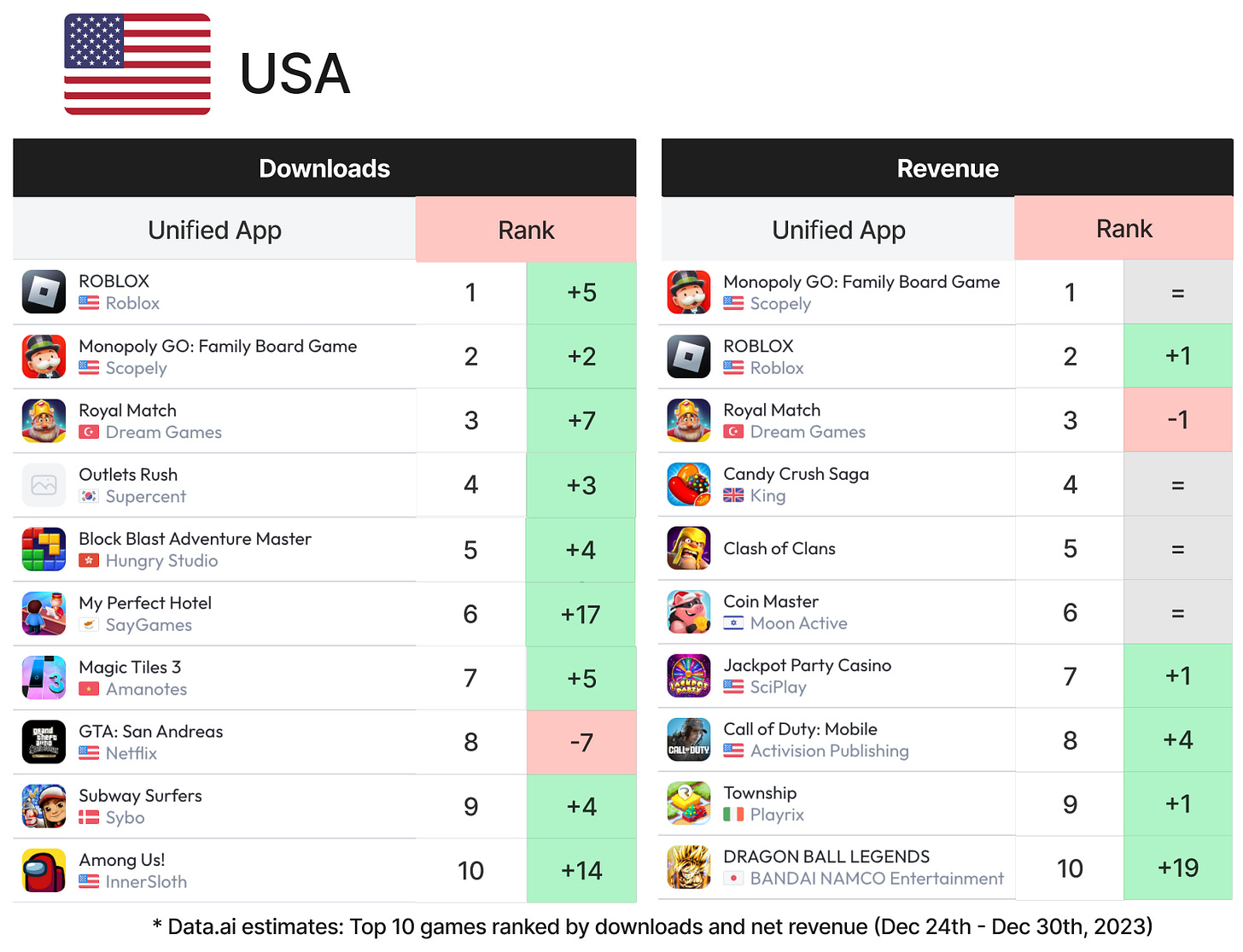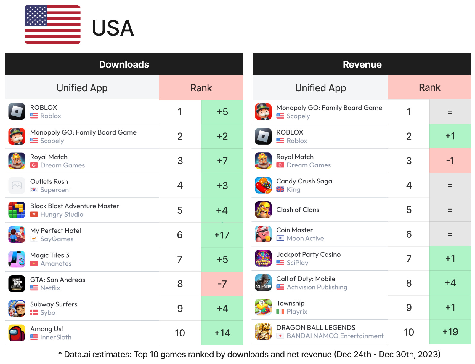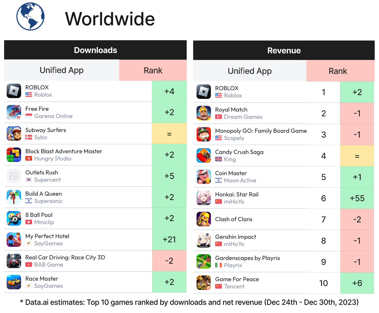 Oh damn, Roblox hit #1. It’s generally in the top 10 for downloads but has hit #1 in downloads and dethroned BOTH Royal Match (the king of revenue) and Monopoly GO for #1 worldwide revenue. Congratulations!