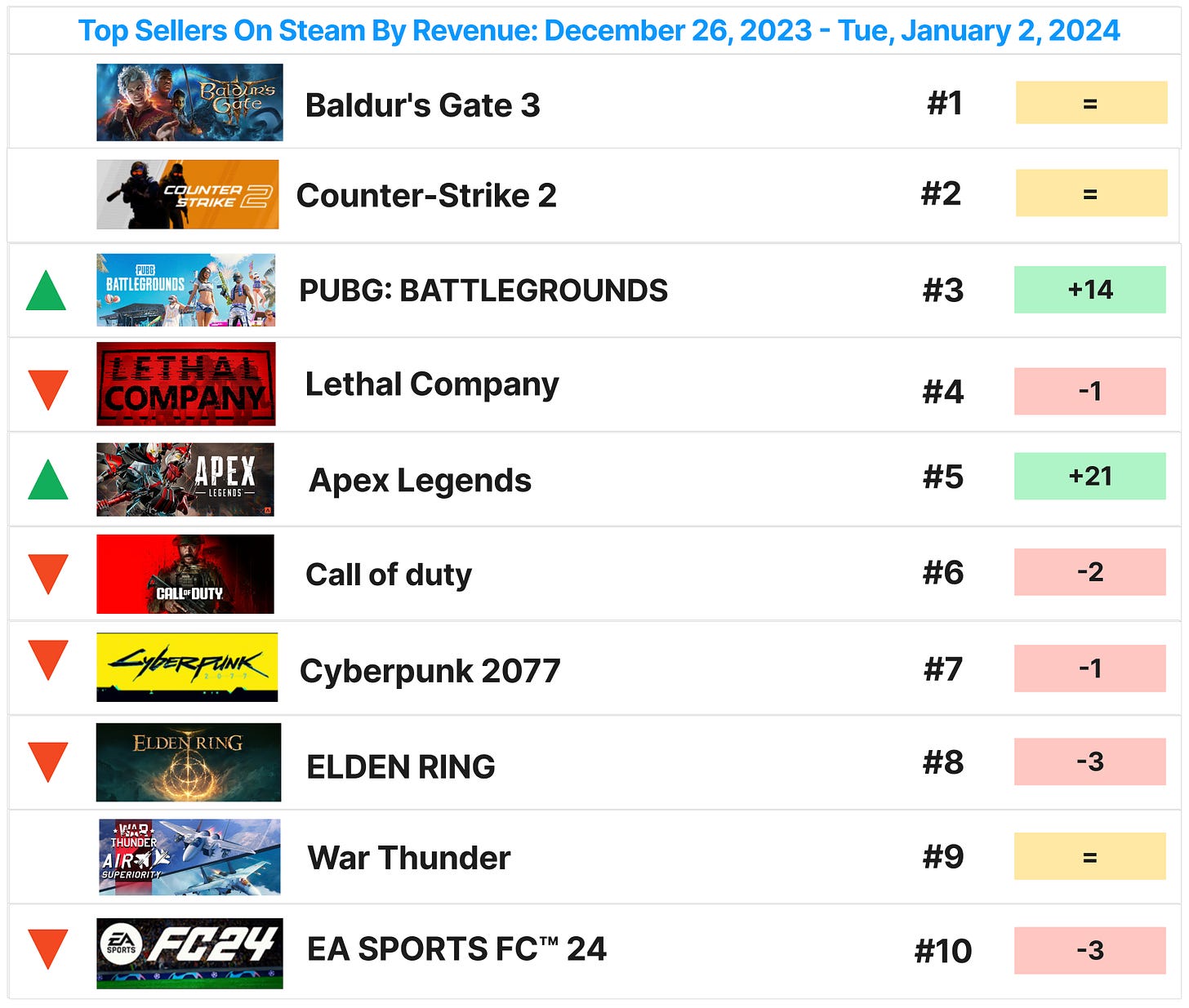 Nice jump by the two shooters, PUBG and Apex Legends, to achieve top revenue on Steam last week!