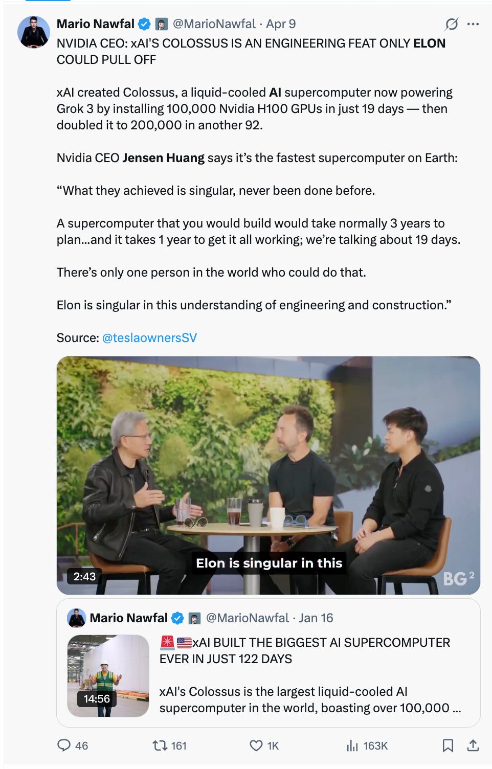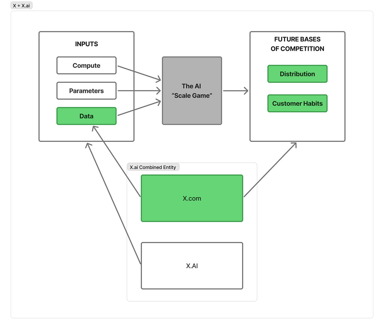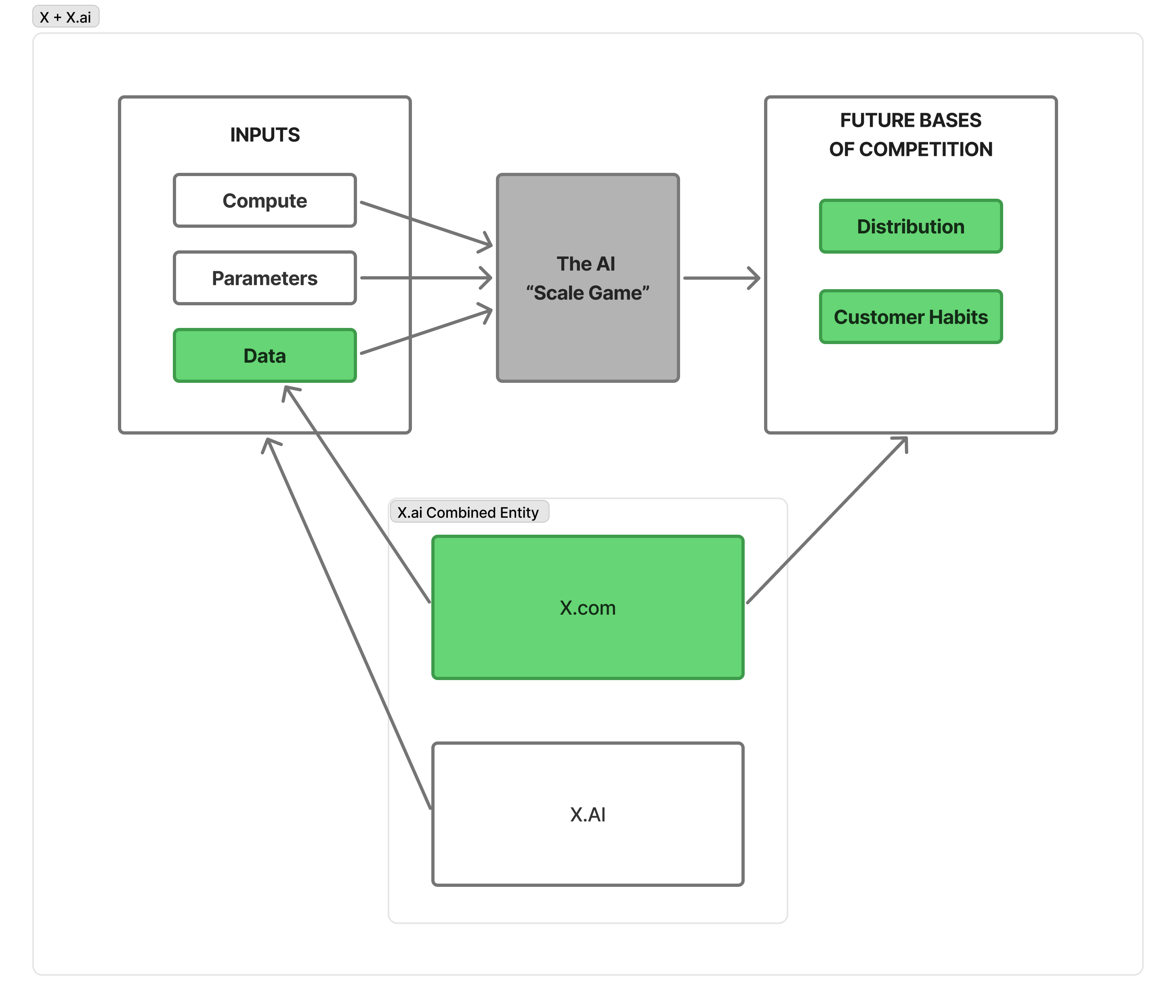 Elon is playing to win again, forcefully acquiring and driving the inputs for the LLM-scale game and securing distribution and exclusive access to X data from the X acquisition.