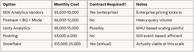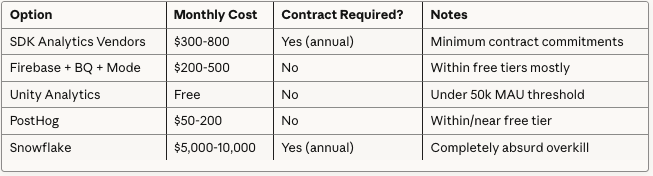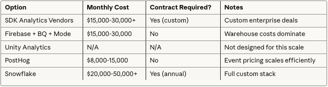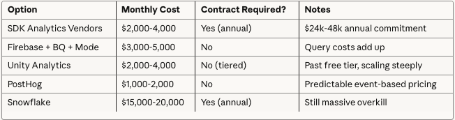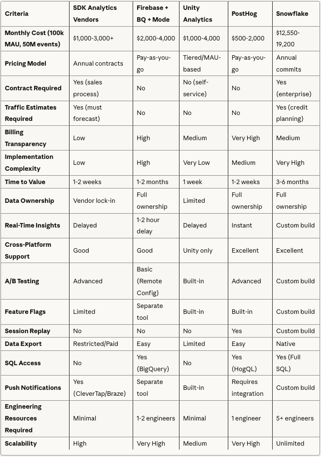 The new meta is clear: warehouse-native, open-source, real-time analytics with built-in experimentation and transparent, contract-free pricing. PostHog hits this mark. Traditional SDK analytics vendors serve a role for marketing-first teams, but are increasingly obsolete for analytics-first use cases. Snowflake is powerful but overkill for 99% of studios.